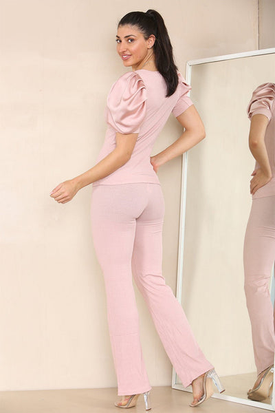 Silky Satin Puff Sleeves Ribbed Lounge Set
